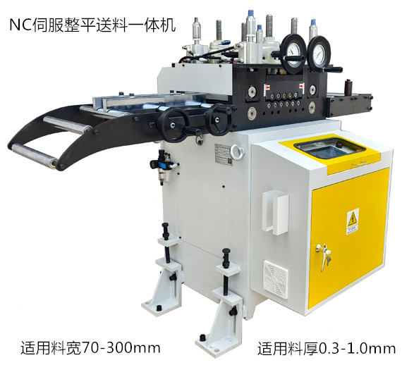 1 、功能簡述:對材料進行矯正同時進行定尺寸送料工作。整平輪和送料輪采用 40cr 鋼經高頻,調質,研磨,鍍硬鉻,精磨。經本機矯正后材料光滑平順無壓痕,不損傷材料表面。主機鋼性 結構強,輸出功率大。