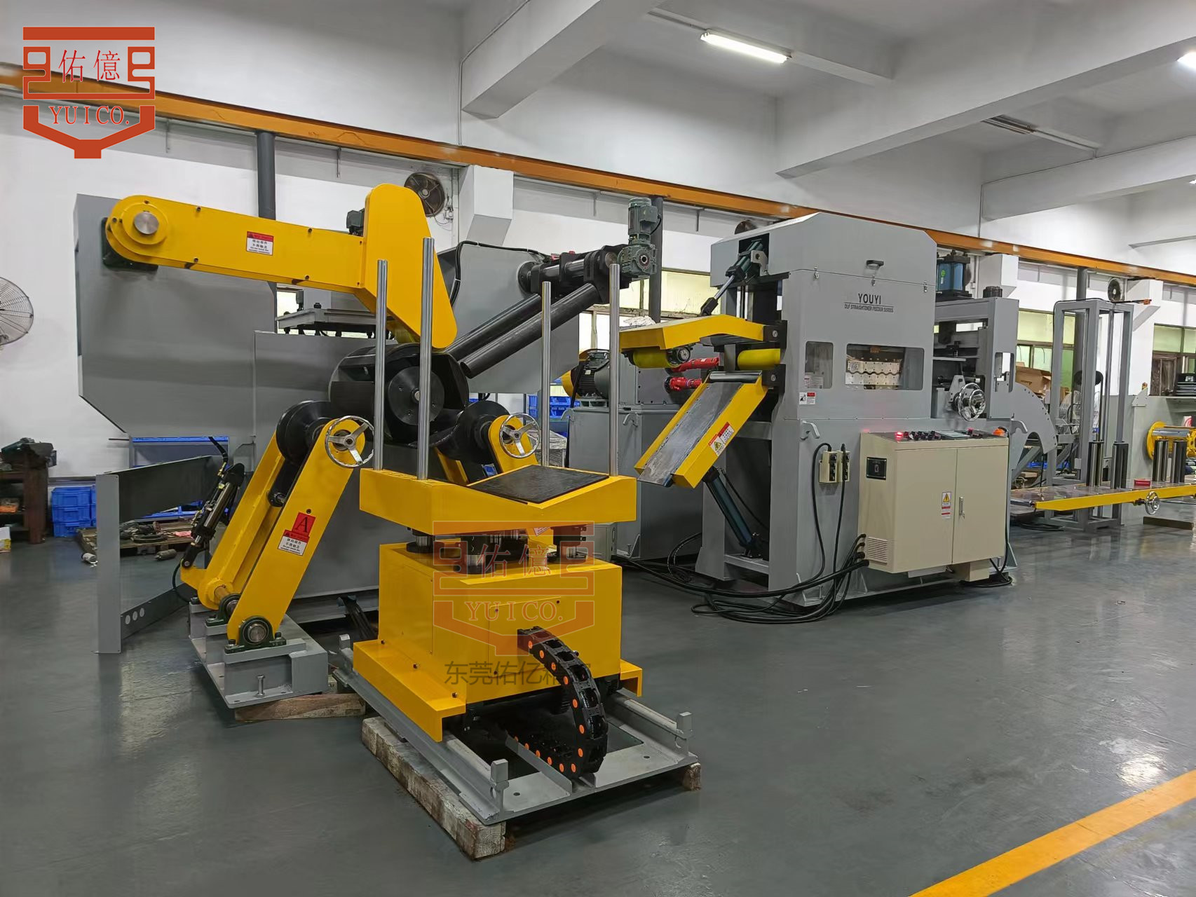 臺車的作用是作用是把材料安全平穩(wěn)地移送到開卷機(jī)主軸中心處。臺車裝備防止料卷傾倒機(jī)構(gòu),安全性更高。自動(dòng)開卷機(jī)固定材料并配合矯正機(jī)把料頭慢慢導(dǎo)入矯正機(jī)然后自動(dòng)放卷,開卷機(jī)由主體機(jī)架,擴(kuò)漲料機(jī)構(gòu),壓料臂,擋料臂,圓盤式壓料臂等部份組成。