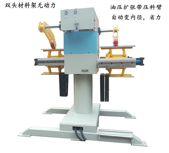 此款雙頭開卷機用于新能源鋰電池極柱沖壓,配上NC偏擺送料機,根據客戶要求定制款,一個料頭載重1噸,采用液壓擴漲方式,壓料臂采用